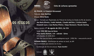 Apresentação de leitura dramatizada da peça “Os Físicos”, de Friedrich Dürrenmatt, produzida pelo Centro Cultural do Poder Judiciário do Estado do Rio de Janeiro – CCPJ-Rio. Elenco formado por magistrados do Tribunal de Justiça do Estado do Rio de Janeiro: Ana Maria Oliveira, André Andrade, Claudio dell’Orto, Cristina Gaulia, Elizabeth Louro, José Muiños Pinheiro, Katya Monnerat, Ricardo Starling. Direção de Sílvia Monte.